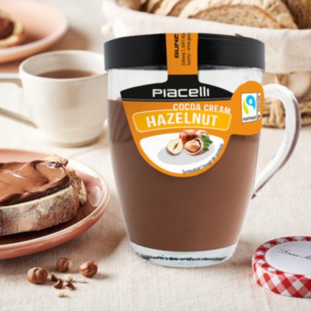 O produto na imagem é o Creme de Cacau e Avelã Piacelli em uma embalagem de 300g, apresentada em um copo de vidro com alça.