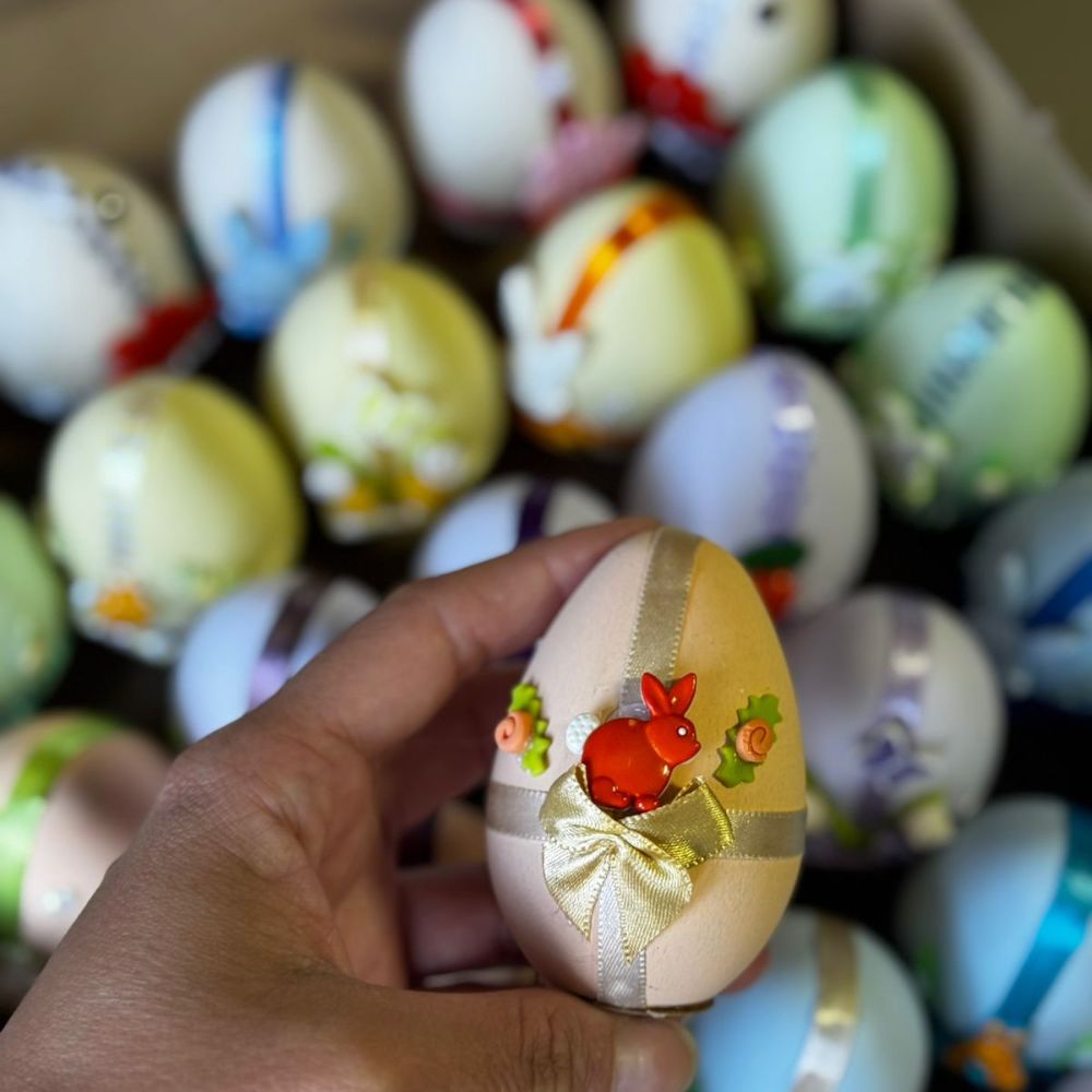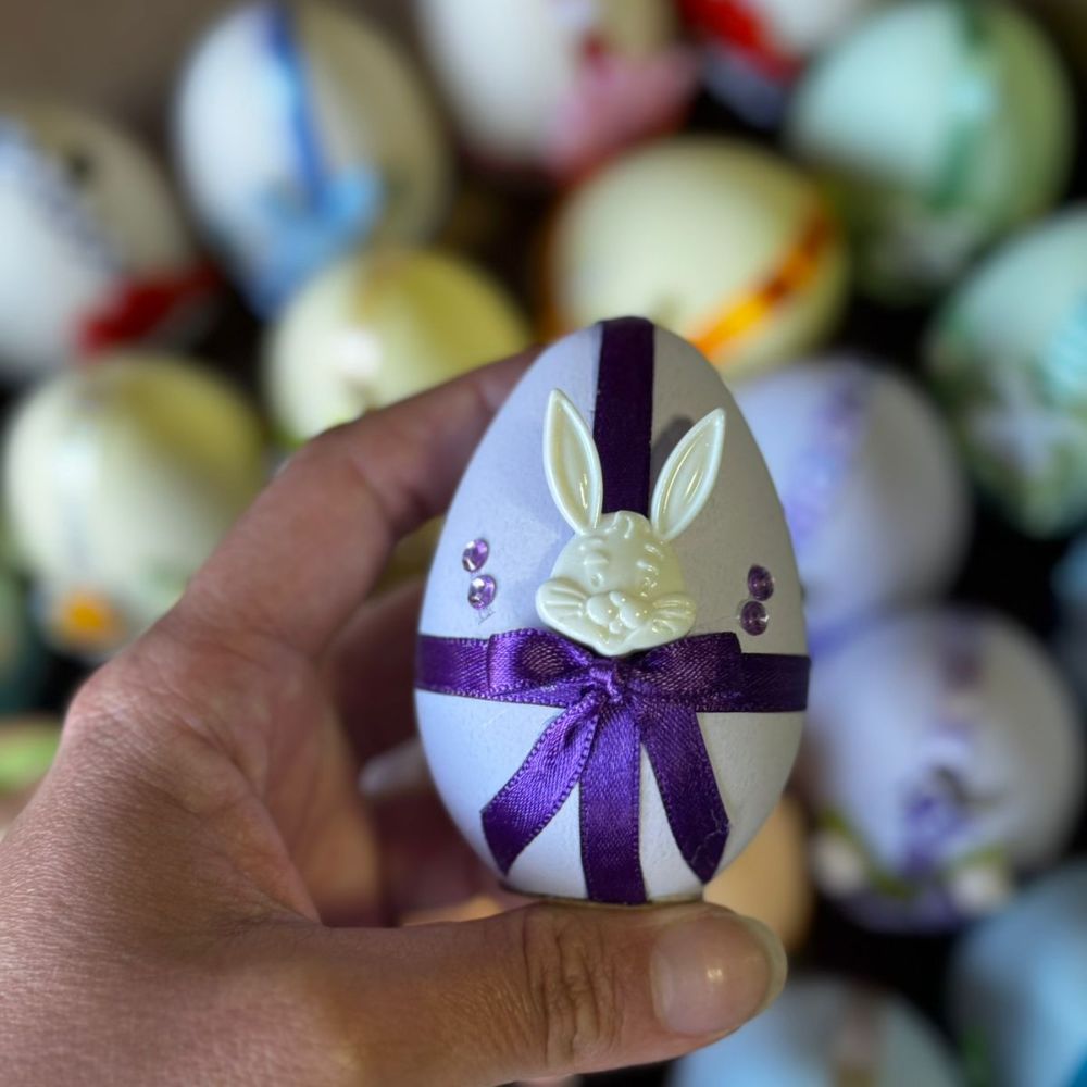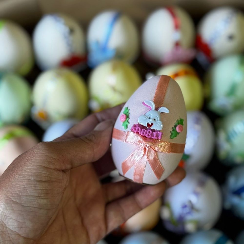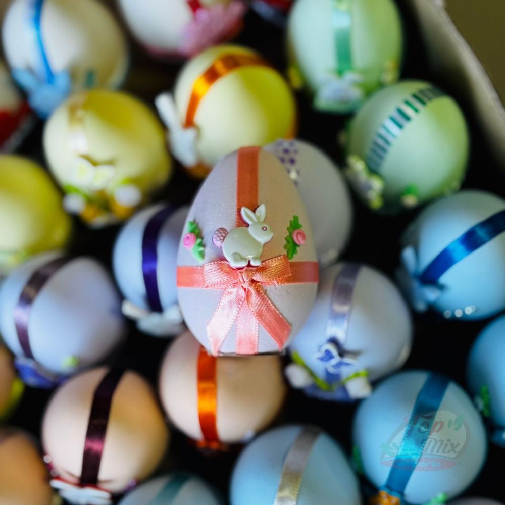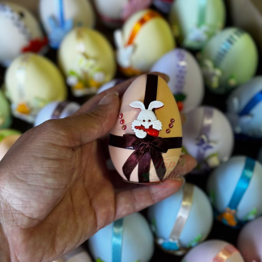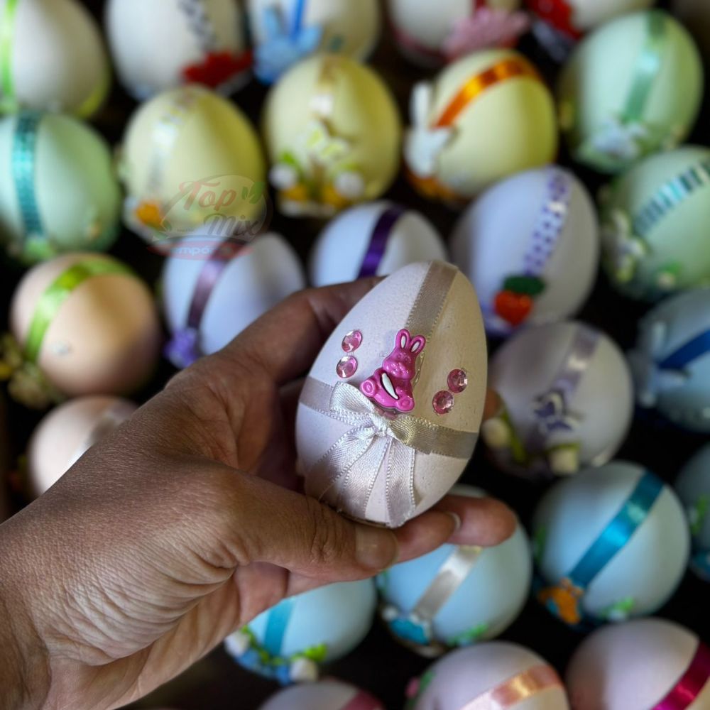 Plastico enfeitado em formato de ovo, recheado com bolinhas de chocolate com amendoim. O tamanho é igual de um ovo de galinha